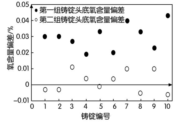 兩組鑄錠頭底氧含量偏差對比